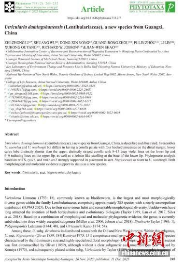 发表狸藻属植物新种——大明山挖耳草的论文截图。广西大明山国家级自然保护区供图