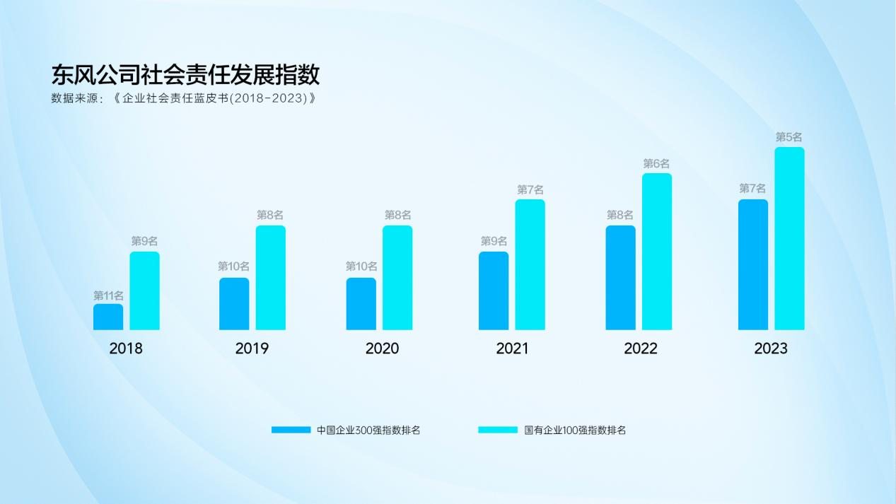 2023年11月16日,由中国社会责任百人论坛、责任云研究院主办的第六届北京责任展暨《企业社会责任蓝皮书(2023)》发布会在京召开。《蓝皮书》显示,东风汽车集团有限公司(下称东风公司)社会责任发展指数综合评分88.4分,位列“国有企业100强指数”排名第5,“中国企业300强指数”排名第7。东风公司不仅连续4年实现了社会责任发展指数排名的持续提升,更首次入围国企社会责任发展指数的5强。
