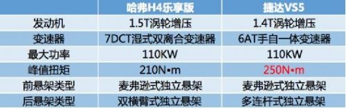 动力是SUV对比的永恒话题,在满足国六排放标准前提下,尽可能提高动力属性是当下所有车企努力的目标。哈弗H4乐享版搭载1.5T发动机,最大功率110KW,峰值扭矩210 N·m。配备曾获得“世界十佳变速器”殊荣的7DCT湿式双离合变速器,激烈驾驶时升降挡速度快,变节奏驾驶也不会显得迟滞,换挡体验和燃油经济性明显比捷达VS5的AT变速器更胜一筹。