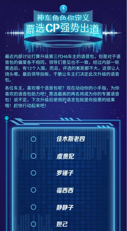 自第三代哈弗H6上市以来,不少用户被第三代哈弗H6强大的个性化语音交互“种草”,“真人语音、虚拟形象、主动交互”,带来全新智能交互新体验。语音导航还在用郭德纲的相声腔?林志玲的甜美腔?这难免有些太千篇一律,新时代的用户需要更个性的语音包。现在,第三代哈弗H6车主有福了!12个语音包坐等你来投票,票数最高的2个将成为新神车新晋热门语音包,用户只需通过FOTA远程升级便可完成更新,进而满足不同用户个性化的语音需求,国民神车的个性化定制让人叹服。