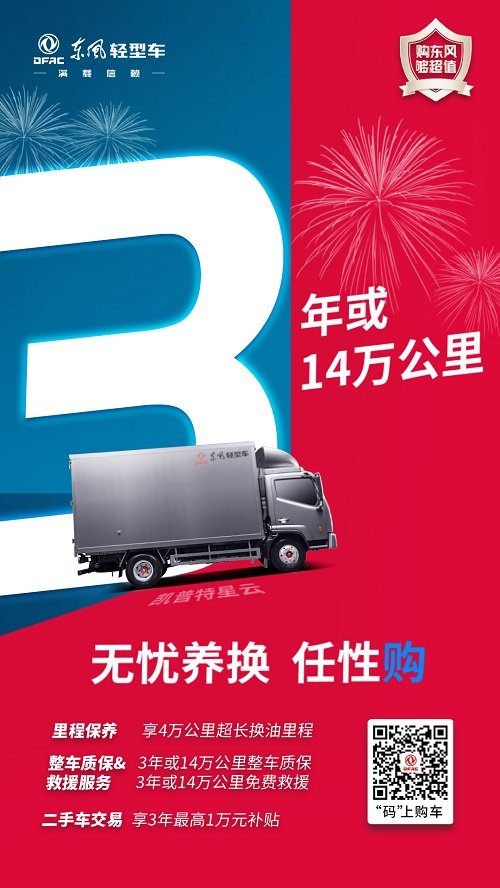 秉承东风轻型车“向客户而生”的品牌价值观,凯普特星云从购车、用车到车辆二次销售,为客户提供全生命周期服务保障。东风轻型车承诺,星云全系车型可享受3年或14万公里整车延保,以及3年或14万公里免费救援政策。不仅如此,凯普特星云还拥有行业首家推出的保值服务——至高10000元二手车交易补贴。客户在购车后第32至38个月期间进行二次交易,可享受服务补贴最高10000元。