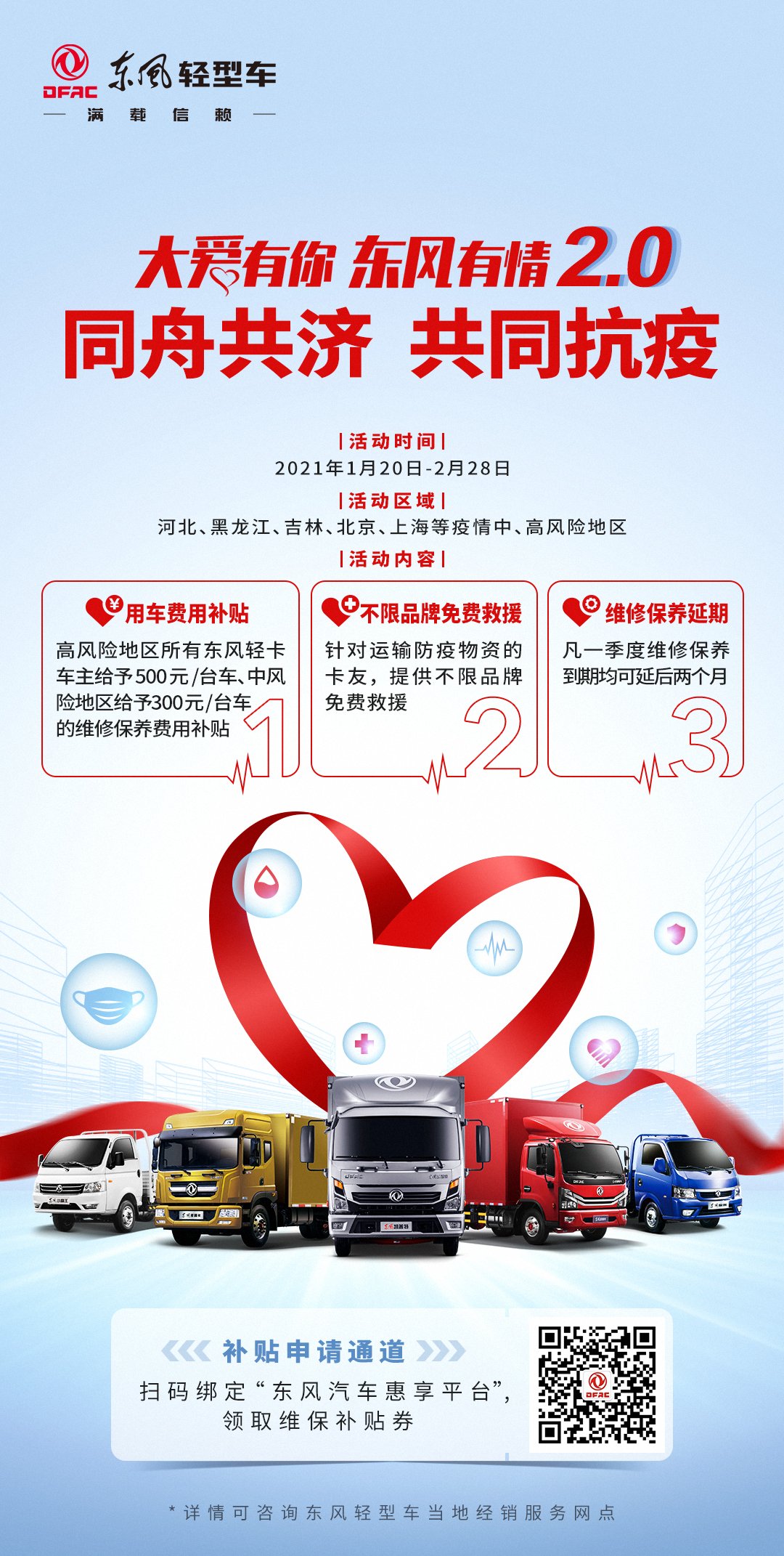 2021年初,面对疫情反复,东风轻型车主动投入260万元开启“大爱有你 东风有情”抗疫2.0行动,为中高风险地区客户提供维修保养费用补贴、免费救援服务等。不仅如此,为尽可能减少客户维保成本,保障车辆性能,东风轻型车为3万名客户免费提供10KG桶装尿素,提供免费全车检查服务……