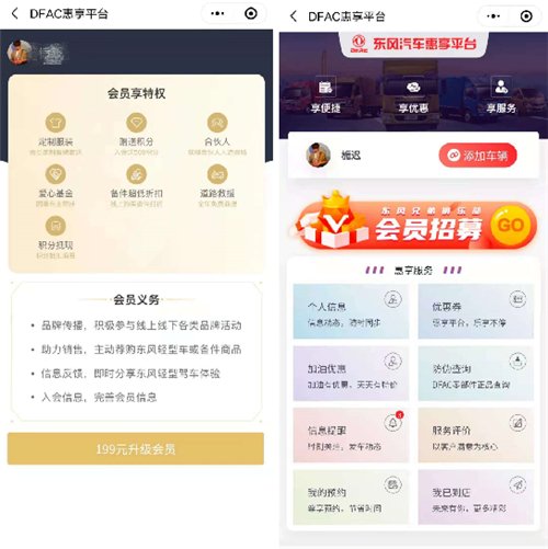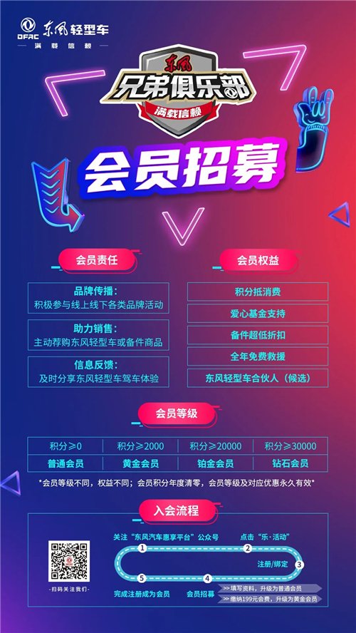 管理更规范。为增强客户归属感,东风兄弟俱乐部对会员入会方式进行统一管理,现在登录东风汽车惠享平台微信公众号,进入“乐·活动”专区,注册账号并录入绑定个人档案信息,提交资料激活即可成为东风兄弟俱乐部普通会员。在该页面,会员可随时查看积分变化及相关权益,归属感更强。