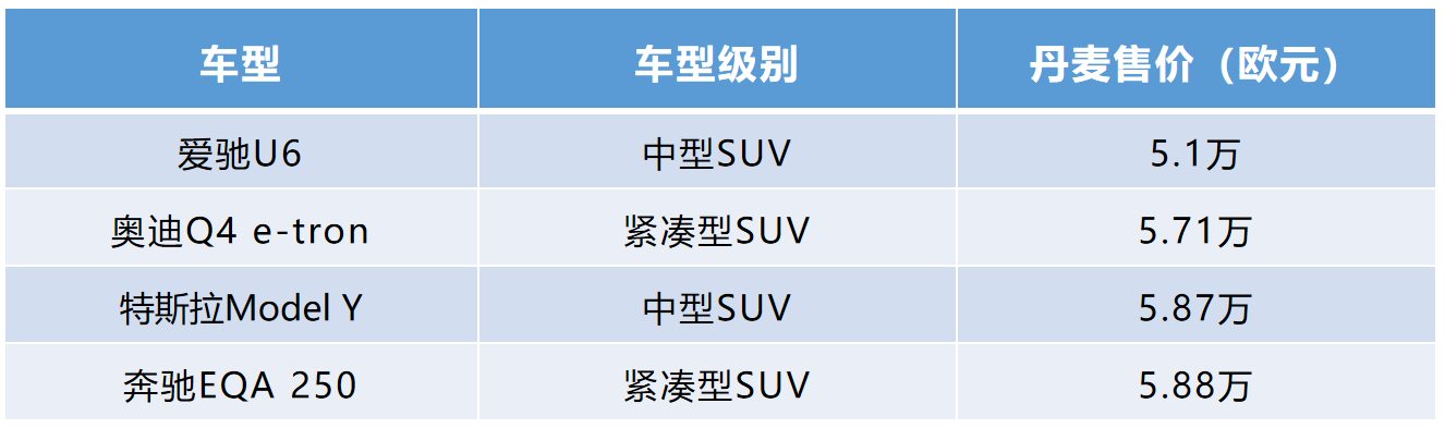 以在丹麦市场的售价为例,欧版爱驰U6售价为379990丹麦克朗,约为5.1万欧元,与特斯拉Model Y、奥迪Q4 e-tron、奔驰EQA 250等车型共同跻身“五万欧元俱乐部”。这意味着以爱驰为代表的中国新锐品牌,已经具备了和海外传统豪强一争高下的实力。如果我们把目光转移到国内市场,中国消费者在国内只需要以21.99万元的价格,就能拿下在欧洲售价约37万元的爱驰U6,价差高达约15万元人民币!这意味着国内消费者享受到的是真真正正的性价比和科技普惠。