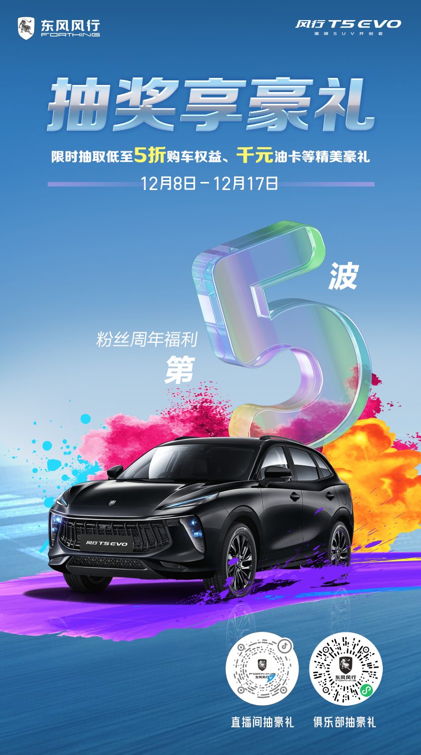本次T5 EVO粉丝2周年庆活动,宠粉力度可谓空前,不管你是有意想要购买T5 EVO这款潮流座驾的准车主,还是说只是一个单纯想要薅羊毛的吃瓜群众,本次活动都会给你带来满满的惊喜。还在犹豫什么?心动不如行动,12月17日19:00,锁定东风风行官方抖音直播间,我们不见不散!
