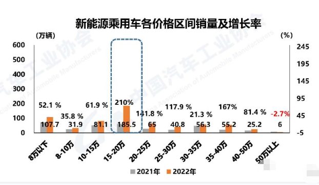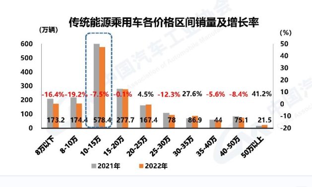 中汽协发布的数据显示,2022年,我国传统燃油乘用车中,主要销量贡献集中在10-15万元,累计销量578.4万辆;新能源乘用车中,主要销量贡献集中在15-20万元,累计销量185.5万辆。