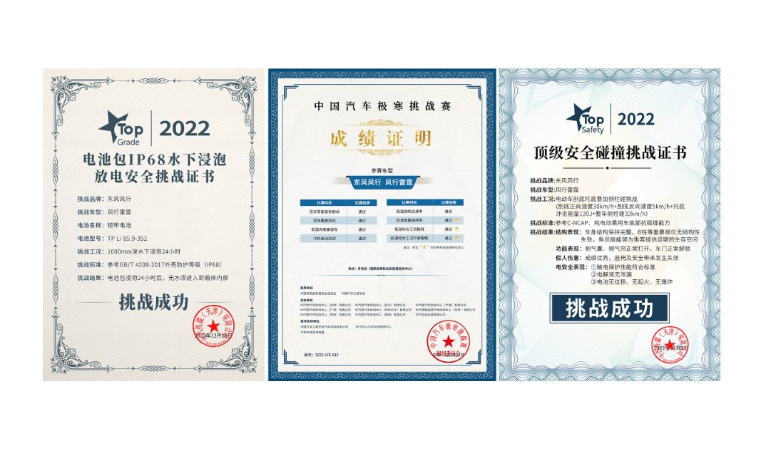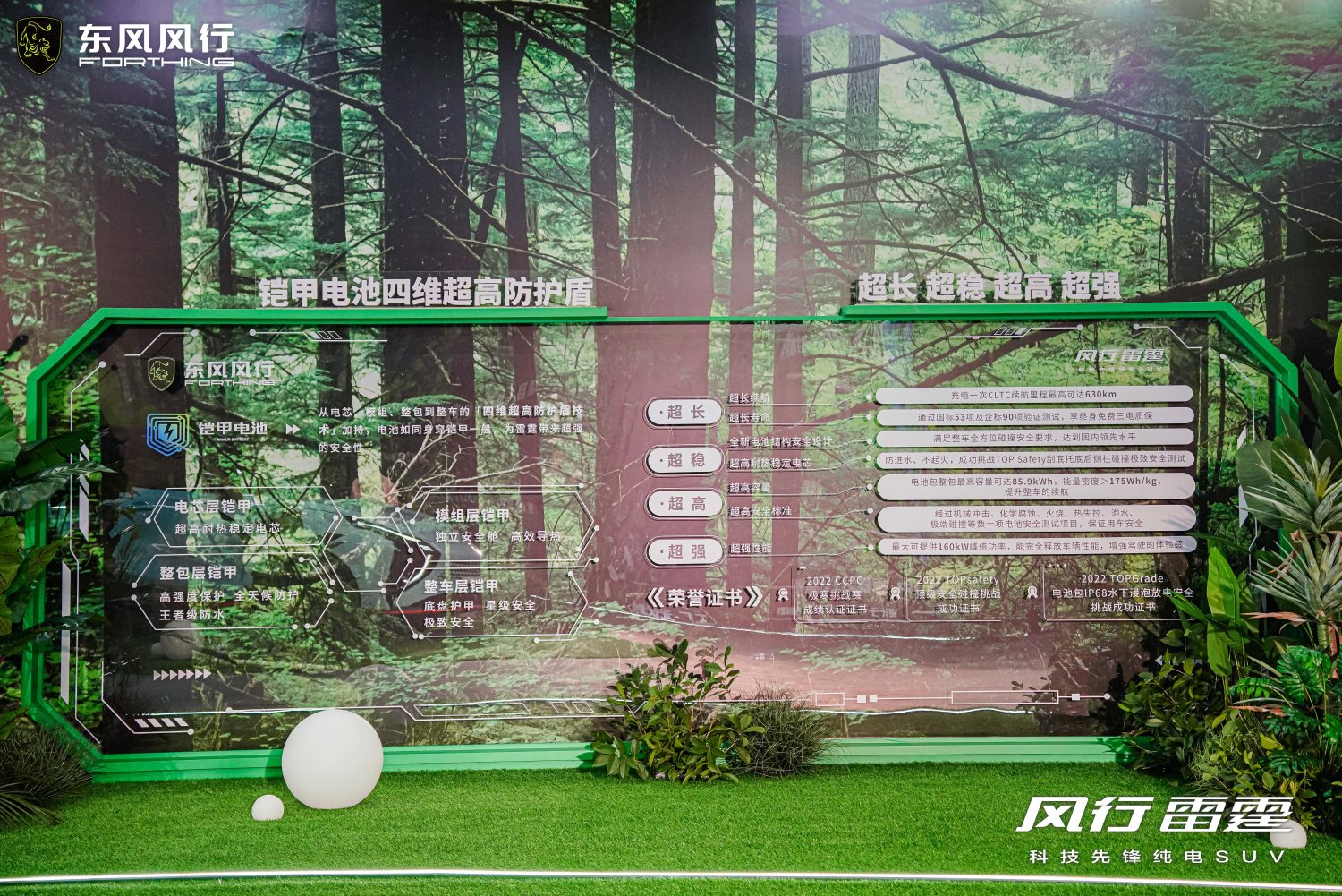 第三,东风风行从续航源头着手,打造了业界领先的铠甲电池技术,以风行雷霆为例,85.9kWh电池容量,超出175Wh/kg的电池能量密度,可以在CLTC工况下实现续航630km的极好成绩。铠甲电池采用四维超高防护盾技术,电芯、模组、整包到整车的四重无死角铠甲防护,通过了严苛的火烧、挤压、水泡以及穿刺检验。