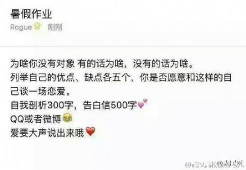 据网友爆料湖北工业大学老师布置暑假作业,要求学生写一封500字告白信,并谈一场恋爱。学生说:“辅导员一言不合就开始虐狗逼我找对象系列,还要大声说出来,这是一道送命题。”