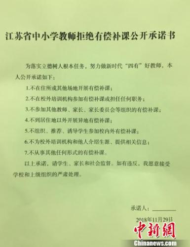 江苏省中小学教师拒绝有偿补课公开承诺书。 申冉 摄