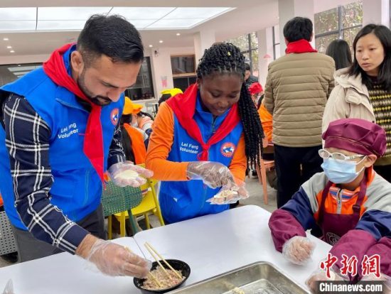留学生们在学习包饺子。 卢梦梦 摄