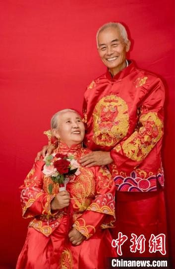 这对相守70余年的夫妻,在临时搭建的红布背景前,笑得格外灿烂,两人布满皱纹的手,始终紧紧地牵在一起。