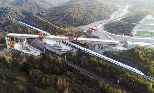 图为当日,一列动车通过转体对接完成后的汉十高铁三墩转体桥施工现场。 新华社发