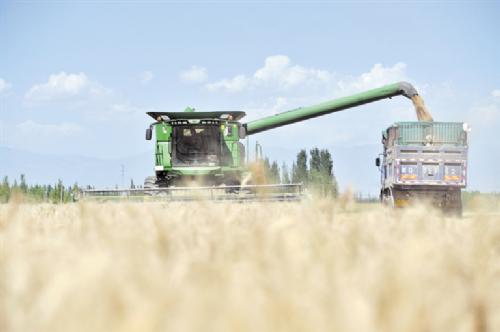 在新疆塔城市齐巴尔吉迭社区,收割机在收割小麦(7月24日摄)