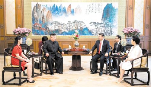 6月20日,中共中央总书记、国家主席习近平在北京钓鱼台国宾馆会见朝鲜劳动党委员长、国务委员会委员长金正恩。习近平总书记夫人彭丽媛、金正恩委员长夫人李雪主参加会见。 新华社记者 李学仁 摄