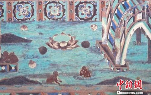 图为莫高窟第148窟东壁(盛唐)。净土世界的莲花池里,常有戏水的小儿。敦煌研究院供图