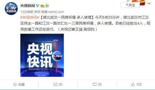 今天(10月24日)8点25分许,湖北武汉市江汉区民主一路和江汉一路交汇处一三层民房坍塌,多人被埋。