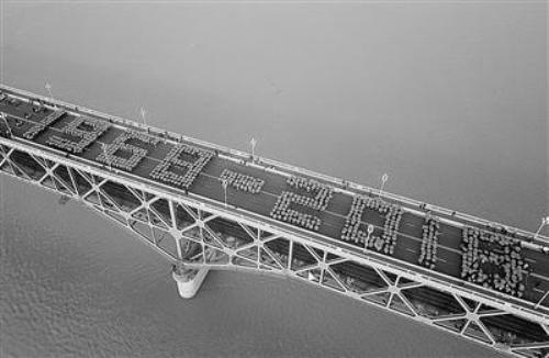 24日,南京市民代表在修葺一新的南京长江大桥桥面拼出了“1968-2018”的字样,向南京长江大桥的建设者、守卫者致敬,为五十岁的南京长江大桥庆生。新华报业视觉中心记者 邵丹 摄