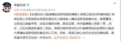 通报称,武汉市江汉区公安分局在发现有网友举报称某知名火锅城有人播放淫秽视频事件后,高度重视,立即成立破案专班,经连日摸排侦查,固定证据,将涉案嫌疑人梁某(男,28岁,口红机售卖投递员)抓获。梁某对其利用手机WIFI破解密码后投屏到火锅店大屏播放淫秽视频的事实供认不讳。
