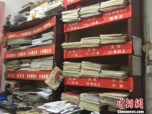 工作室内一整面墙的书架上摆放着近9.5万份相亲者的资料,封面上标注着“大女”“再婚男”“外省外国”等字样,按地域、婚史和年龄分区存放。“我们年龄虽大,神志和记忆却清楚得很,哪对男女条件合适,我们马上想得起来。”陈轶伦说。