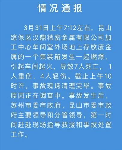据江苏省昆山市政府新闻办公室官方微信消息,3月31日上午7时12分左右,昆山综保区汉鼎精密金属有限公司加工中心车间室外场地上存放废金属的一个集装箱发生一起燃爆,引起车间起火,导致7人死亡, 1人重伤,4人轻伤。
