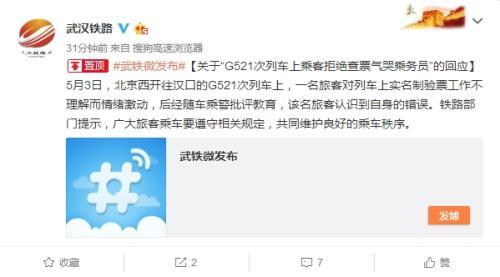 3日晚,一段“高铁乘客拒绝查票气哭乘务员”的视频引发网友热议。中国铁路武汉铁路局集团有限公司官方微博5日发布通报称,5月3日,北京西开往汉口的G521次列车上,一名旅客对列车上实名制验票工作不理解而情绪激动,后经随车乘警批评教育,该名旅客认识到自身的错误。铁路部门提示,广大旅客乘车要遵守相关规定,共同维护良好的乘车秩序。
