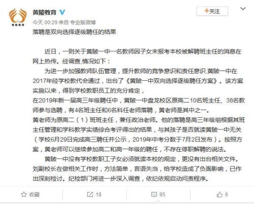 黄老师为原高二(1)班班主任,兼任政治老师。他的落聘是高三年级组根据其班主任管理和学科教学实绩综合考评得出的结果,与其孩子是否就读黄陂一中无关(学校6月29日完成高三聘任并公示,2019年中考分数于7月2日发布)。按照方案,黄老师可以继续参加高二和高一年级的聘任,不存在停职解聘的说法。