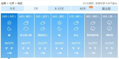 北京市气象台预计,今天早晨到白天多云(东部地区有阵雨)转晴,早晨有轻雾,北转南风2、3级,最高气温34℃,最小相对湿度50%;夜间晴间多云,最低气温25℃。