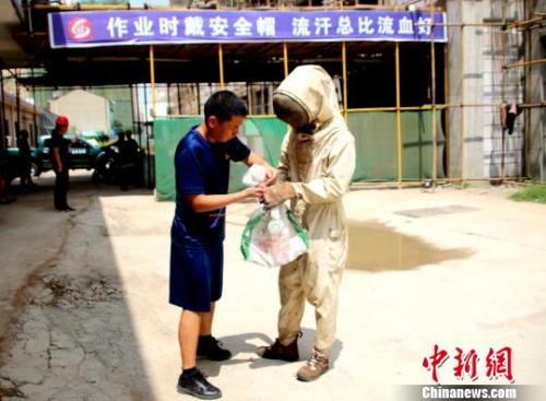 到达现场后,消防员发现马蜂窝位于工地一楼的预制板上,呈足球大小,离地面近5米,蜂窝孔洞里不时有马蜂飞出。在撤离附近人员后,一名经验丰富的消防员穿上防蜂服,借助活动脚手架,用编织袋套住马蜂窝实施摘除。在扎好编织袋口后,不少飞回来马蜂见巢穴被摘,对消防员进行攻击,消防员对其进行点火喷射处理。