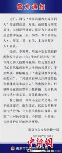 30日,南京鼓楼警方发布通报,近日网传的“南京凤凰西街连杀四人”消息和视频,系编造虚构。警方已抓获两名发布虚假信息人,并对两人进行了处理。