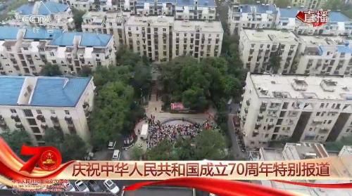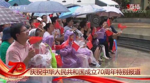 央视记者杨光:今天南京是一个小阵雨的天气,非常幸运的是在上午的时候没有下雨,因此100多位老百姓就在小广场上通过户外的大屏收看了我们转播的国庆盛典的仪式。现在虽然下起了小雨,大家仍然披着雨披不愿意走。