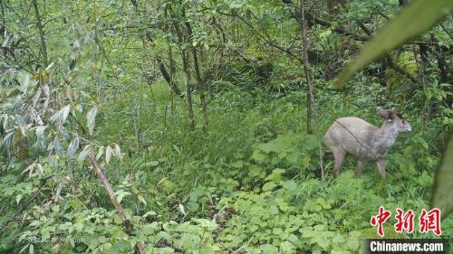 出现在神农架的白化毛冠鹿。神农架国家公园管理局供图