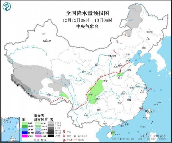 今后三天,我国雨雪总体来看仍旧稀少,主要出现在东北和西南两片区域,中央气象台预计,12月12日08时至13日08时,西藏大部、青海南部、内蒙古东部等地有小到中雪或雨夹雪,其中,西藏西南部的部分地区有大雪,局地暴雪(10~15毫米)。四川东部、陕西南部等地的部分地区有小雨。