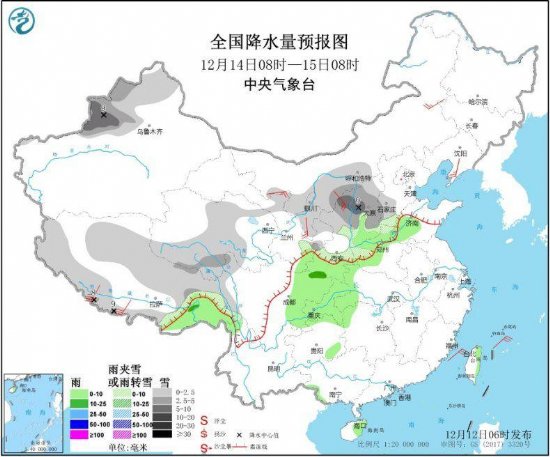 12月14日08时至15日08时,新疆北部、青藏高原中东部和西南部、西北地区东北部、华北西部和南部、黄淮西部山区等地的部分地区有小到中雪或雨夹雪,其中,新疆伊犁河谷、陕西北部、山西西部等局地有大雪(5~9毫米)。西北地区东南部、黄淮中西部、江汉西部、西南地区东部、海南岛等地的部分地区有小雨,局地中雨。