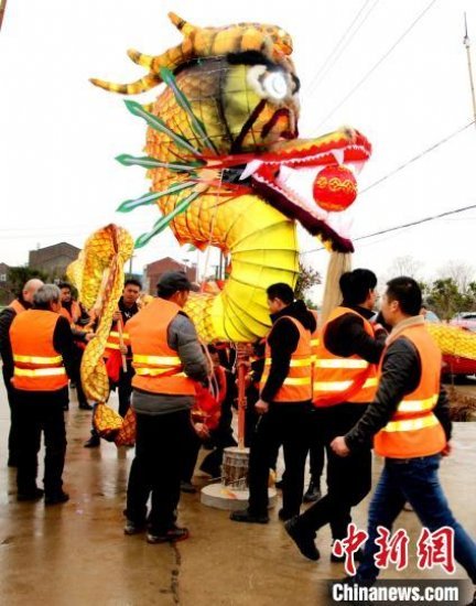 在湖北孝昌县花园镇已经消失20多年的“火龙”,近日由知名手艺人黄志敏制作完成,该县花园镇村民们敲锣打鼓,舞起百余米长的龙灯迎接新年到来。