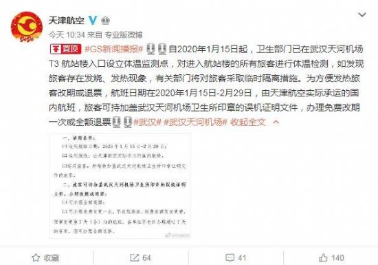 天津航空:武汉天河机场出港发热旅客可全额退改签