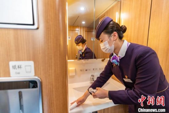G102次列车工作人员做好洗漱台、把手等重点部位的日常消毒。 李忱 摄