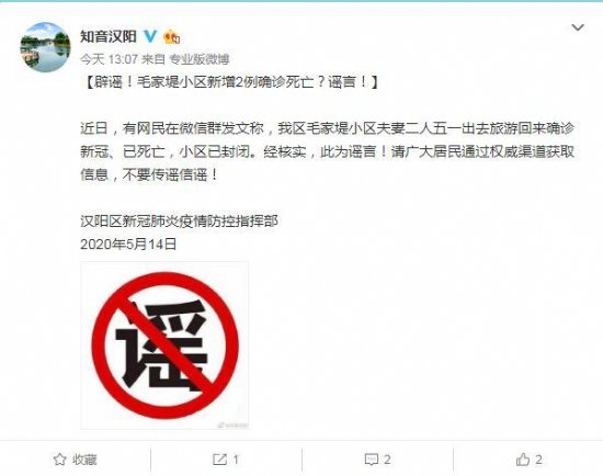 据武汉市汉阳区委宣传部官方微博消息,汉阳区新冠肺炎疫情防控指挥部14日发布辟谣消息称:近日有网民在微信群发文,称汉阳区毛家堤小区夫妻二人五一出去旅游回来确诊新冠、已死亡,小区已封闭。经核实,此为谣言。