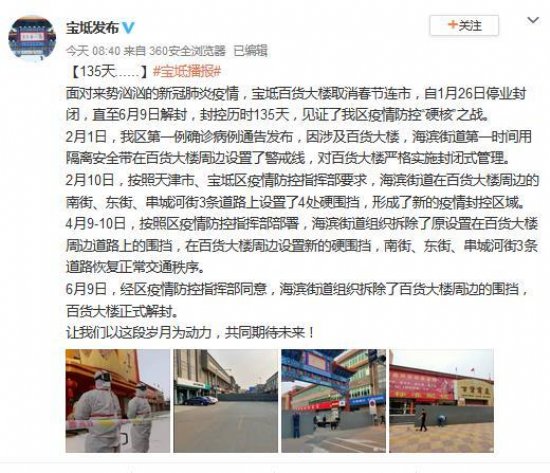 据天津市宝坻区政府官方微博消息,6月9日,经天津市宝坻区疫情防控指挥部同意,宝坻区百货大楼正式解封。该百货大楼因涉及新冠肺炎确诊病例自1月26日停业封闭,直至6月9日解封,封控历时135天。