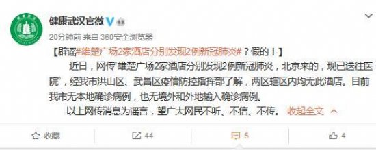 针对近日网传的“雄楚广场2家酒店分别发现2例新冠肺炎,北京来的,现已送往医院”相关消息,武汉市卫健委官方微博17日辟谣称,经武汉市洪山区、武昌区疫情防控指挥部了解,两区辖区内均无此酒店。
