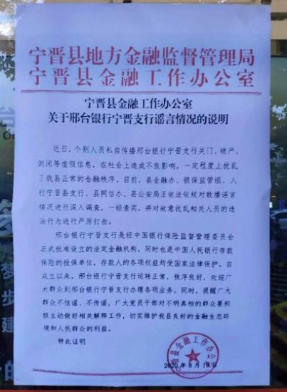 就此事,宁晋县金融工作办公室发布辟谣声明称,个别人员私自传播邢台银行宁晋支行关门、破产、倒闭等虚假信息,在社会上造成不良影响,一定程度上扰乱了宁晋县正常的金融秩序。相关部门正依法依规对散播谣言情况进行深入调查,一经查实,将对故意扰乱相关人员的违法行为进行严厉打击。邢台银行宁晋支行运转正常,秩序良好,提醒广大群众不信谣、不传谣。