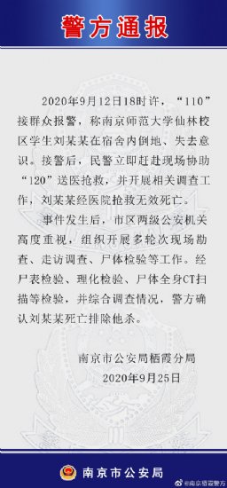 南京市公安局栖霞分局官方微博25日发布警情通报称,2020年9月12日18时许,“110”接群众报警,称南京师范大学仙林校区学生刘某某在宿舍内倒地、失去意识。接警后,民警立即赶赴现场协助“120”送医抢救,并开展相关调查工作,刘某某经医院抢救无效死亡。