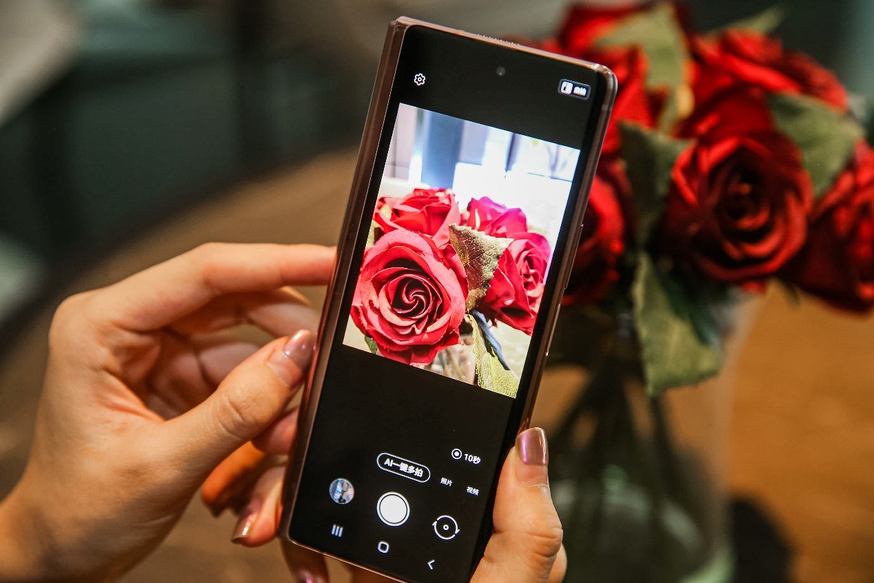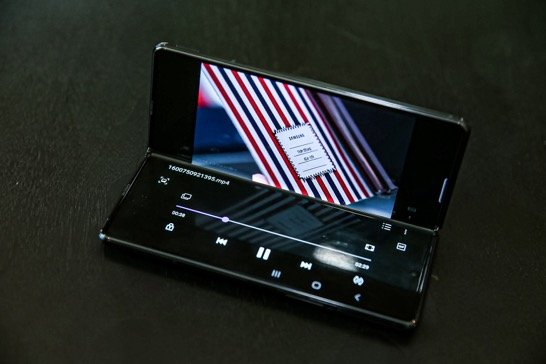 在一定折叠角度下拍照,屏幕上下两部分显示不同的内容,上半部分显示取景,下半部分显示拍照按钮以及照片预览,可以带来不一样的拍照体验。