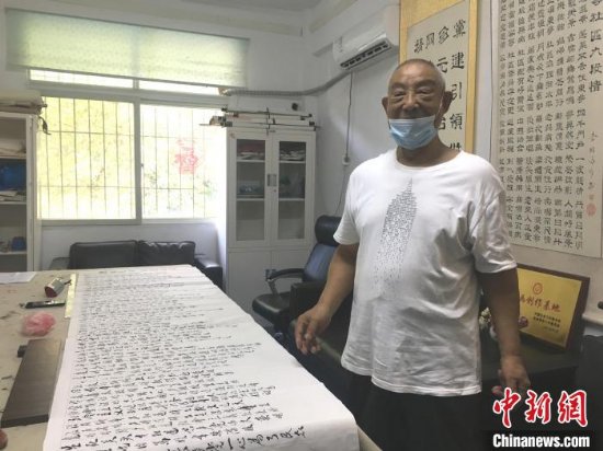 东亭社区78岁老人李贻清正在展示其创作的书法作品。中新社 万淑艳 摄 万淑艳 摄