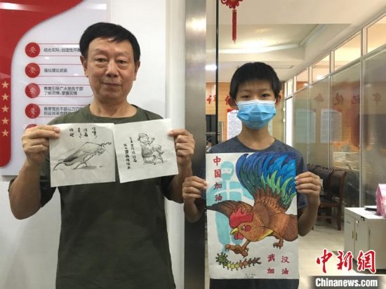 社区居民王福文(左)和外孙正在展示他们创作的武汉抗疫绘画作品。中新社 万淑艳 摄 万淑艳 摄
