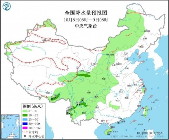 10月8日08时至9日08时,新疆北疆北部、青海东南部、内蒙古东北部等地的部分地区有小到中雪或雨夹雪;西藏东部、内蒙古中东部、西北地区东部、西南地区大部、海南岛、台湾岛等地的部分地区有小到中雨,其中,四川西南部、云南西部、西藏东南部、海南岛东南部等地局地有大雨或暴雨(50~60毫米)。西藏中西部、内蒙古中西部、西北地区东部、东北地区南部、山东半岛、江南东部、海南岛等地的部分地区有4~6级风,其中,西藏中西部、浙江东部沿海地区等地的部分地区风力可达7~8级。