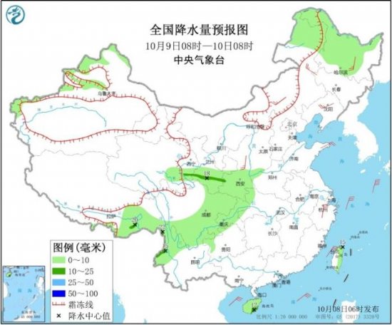10月9日08时至10日08时,新疆北疆北部和沿天山地区、内蒙古东北部、青海东南部等地的部分地区有小到中雪或雨夹雪;黑龙江中西部、西北地区东南部、西藏东南部、西南地区东部和南部、海南岛、台湾岛等地的部分地区有小到中雨。内蒙古中东部、东北地区中南部、江南东北部等地的部分地区有4~6级风。