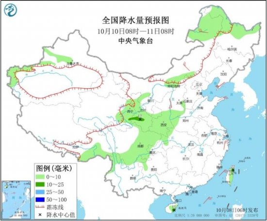 10月10日08时至11日08时,新疆沿天山地区、内蒙古东北部、青海东南部等地的部分地区有小到中雪或雨夹雪;黑龙江北部、西北地区东南部、华北西部、西藏东南部、四川盆地、云南北部、海南岛、台湾岛等地的部分地区有小到中雨。内蒙古大部、辽东半岛、山东半岛、江南东北部等地的部分地区有4~6级风。