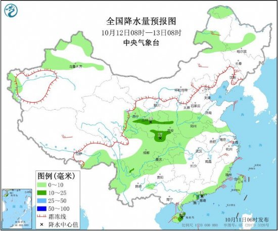 10月11日08时至12日08时,新疆北疆北部和南疆西部、内蒙古东北部、东北地区大部、青海东南部、西藏东南部、西北地区东南部、西南地区东部和南部、江汉北部、黄淮北部和西部、山西南部、海南岛、台湾岛等地的部分地区有小到中雨,局地大雨(25~30毫米),其中,南疆西部山区、青海东南部、内蒙古东北部、黑龙江西北部等地的部分地区有雨夹雪或小雪。内蒙古中东部、东北地区南部、河北北部、陕西北部、山东半岛等地有4~6级风(见图1)。