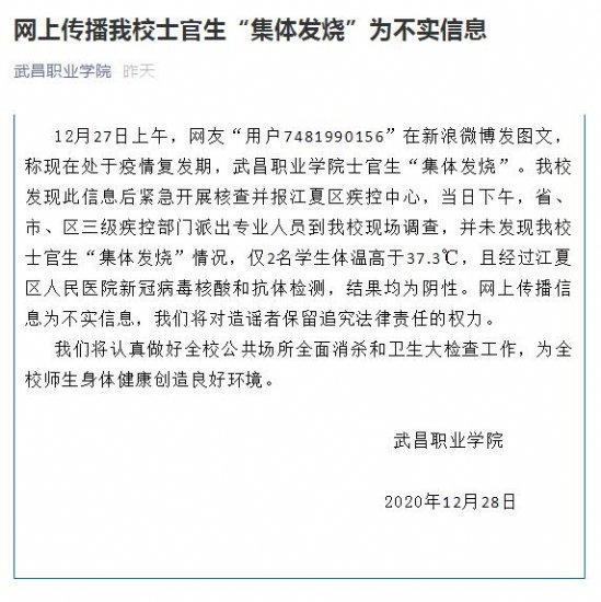 武昌职业学院称,12月27日上午,网友“用户7481990156”在新浪微博发图文,称现在处于疫情复发期,武昌职业学院士官生“集体发烧”。学校发现此信息后紧急开展核查并报江夏区疾控中心,当日下午,省、市、区三级疾控部门派出专业人员到学校现场调查,并未发现学校士官生“集体发烧”情况,仅2名学生体温高于37.3℃,且经过江夏区人民医院新冠病毒核酸和抗体检测,结果均为阴性。网上传播信息为不实信息,将对造谣者保留追究法律责任的权力。