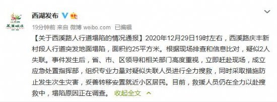 据浙江省杭州市西湖区人民政府办公室官方微博消息,2020年12月29日19时左右,西溪路庆丰新村段人行道突发地面塌陷,面积约25平方米。根据现场排查和信息比对,疑似2人失联。事件发生后,省、市、区领导和相关部门高度重视,立即赶赴现场,成立应急处置指挥部,组织专业力量对疑似失联人员进行全力搜救,同时采取措施防止发生次生灾害,妥善转移安置就近小区居民。目前,救援人员仍在全力以赴搜救中,塌陷原因正在调查。